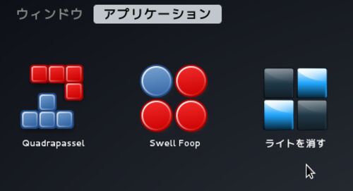 lightsoff というゲームだった。 こんな意味不明な日本語化されるくらいなら、英語のままのほうが100倍マシだと思う。 GNOME3のインターフェースの使い勝手が悪いのも原因のひとつ。 マウスカーソルを乗せたら説明が出るとかすればいいのに、タッチパネルを…